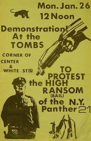 Título: Demostration! At the tombs. Mon. Tan. 26. 12 Noon. Corner of Center and white St (s). To protest the high ranson (bail)of the N. Y. Panter 21