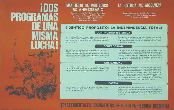 Título: Dos programas de una misma lucha! Manifiesto de Montecristi, 80 aniversario suscrito por José Martí Delegado del Partido Revolucionario Cubano y Máximo Gómez... La Historia me absolverá. Documento denuncia de Fidel Castro...