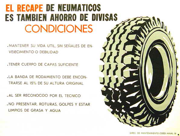 Título: El Recape de neumáticos es también ahorro de divisas. Condiciones. Mantener su vida útil sin señales de envejecimiento o debilidad. Tener cuerpo de capas... Direc. de Mantenimiento