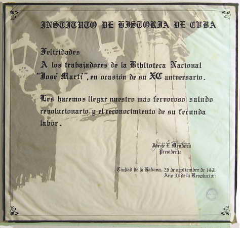 Título: Felicidades. A los trabajadores de la Biblioteca Nacional "José Martí", en ocasión de su XC aniversario...