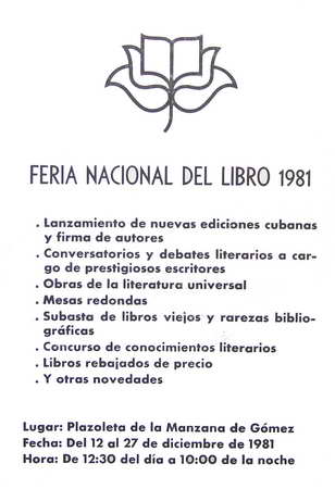 Título: feria Nacional del Libro, lanzamiento de nuevas ediciones cubanas y... del 12 al 27 de dic. Plazoleta de la Manzana de Gómez